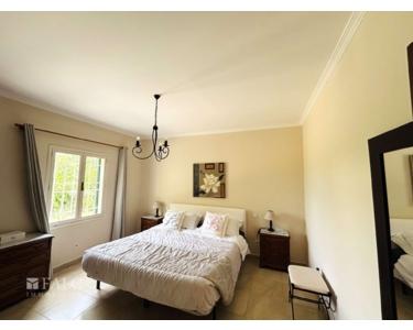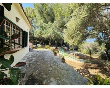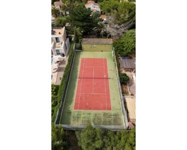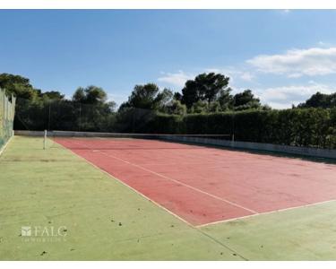 Der Außenbereich ist von einem üppigen, grünen Garten mit einer Vielzahl an Pflanzen und Bäumen umgeben. Die Highlights des Anwesens sind ein wunderschöner Pool mit Sonnenterrasse, ein spektakulärer Tennisplatz und – als besonderes Extra – eine eigene Mini-Golf-Anlage, sodass man das Haus kaum verlassen muss. Außerdem verfügt das Anwesen über eine großzügige Garage mit Platz für zwei Fahrzeuge.