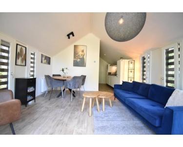 Das helle Wohnzimmer bildet das Herz dieses modernen Chalets. Die offene Verbindung zur Küche schafft ein großzügiges Raumgefühl trotz der kompakten 44 m². Die Terrassentüren zur Terrasse sorgen für eine perfekte Innen-Außen-Verbindung. Von der komfortablen Sitzecke blicken Sie direkt auf den Bach und die grüne Umgebung. Die moderne Einrichtung mit blauen Akzenten und Holzdetails strahlt Wärme und Gemütlichkeit aus. Der Esstisch bietet Platz für vier Personen für gesellige Mahlzeiten.