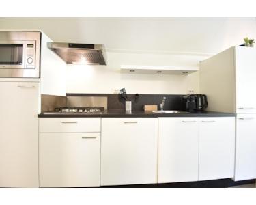 Die moderne offene Küche in eleganter weißer Ausführung bietet allen Komfort für kulinarische Momente. Die Küche verfügt über komplette Einbaugeräte einschließlich Gasherd, Mikrowelle, Kühlschrank und Dunstabzug. Die dunkle Arbeitsplatte bildet einen schönen Kontrast zu den weißen Schränken und bietet ausreichend Arbeitsfläche. Die praktische Aufteilung und großzügigen Staumöglichkeiten machen das Kochen zum Vergnügen. Die offene Verbindung zum Wohnzimmer hält den Koch in der Gesellschaft eingebunden und vergrößert das Raumgefühl.