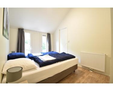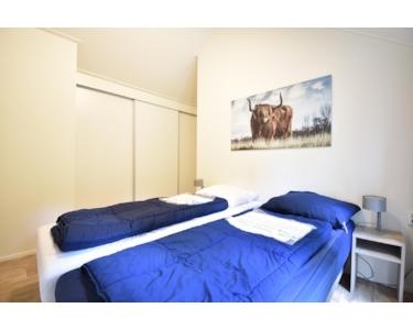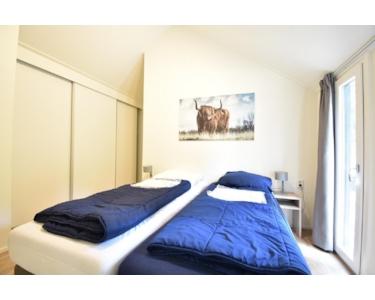 Das Hauptschlafzimmer bietet Ruhe und Komfort mit zwei separaten Betten, die flexibel genutzt werden können. Der große Kleiderschrank mit Schiebetüren sorgt für allen benötigten Stauraum. Das Fenster bietet Aussicht auf die grüne Umgebung und sorgt für ausreichend natürliches Licht. Die neutralen Farben und moderne Ausstattung schaffen eine ruhige Atmosphäre. Die Zentralheizung garantiert eine behagliche Temperatur in allen Jahreszeiten.