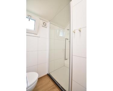 Das moderne Badezimmer strahlt Luxus aus mit seiner eleganten weißen Ausstattung und hochwertigen Materialien. Die großzügige ebenerdige Dusche mit Glaswand bietet Komfort und Bequemlichkeit. Das moderne Waschbecken mit Spiegel und Stauraum ist praktisch eingerichtet. Die Toilette vervollständigt die sanitären Einrichtungen. Die hellen Fliesen und durchdachte Aufteilung sorgen für eine zeitlose Ausstrahlung, die jahrelang Bestand hat.