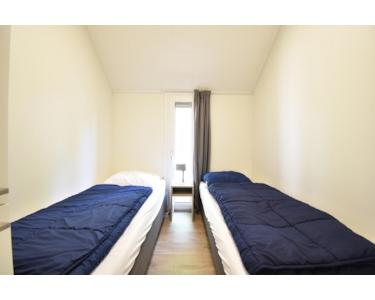 Das zweite Schlafzimmer ist kompakt aber funktional mit zwei komfortablen Einzelbetten eingerichtet. Dieser Raum ist perfekt für Kinder oder Gäste geeignet. Das Fenster sorgt für natürliches Licht und Belüftung. Die praktische Aufteilung maximiert den verfügbaren Raum optimal. Die moderne Ausstattung und neutralen Farben passen perfekt zum Rest des Hauses