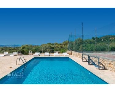 Der außenliegende Poolbereich mit großzügiger Sonnenterrasse wird zum Mittelpunkt entspannter Ferientage. Hier lässt man den Blick in die Ferne schweifen, hört nur das Zirpen der Grillen und das sanfte Plätschern des Wassers. Für die Aktiven wartet ein echtes Highlight: ein eigener Tennisplatz, eingebettet in die grüne Umgebung – ideal für ein morgendliches Match mit Aussicht.