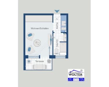 Dieses Apartment im Berliner-Ring 27-29 in Wyk auf Föhr bietet eine funktionale Kochnische mit eingebauter Küchenzeile, ein Badezimmer mit Tageslicht und Dusche sowie einen kombinierten Wohn- und Schlafbereich.