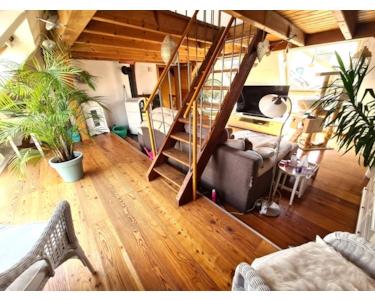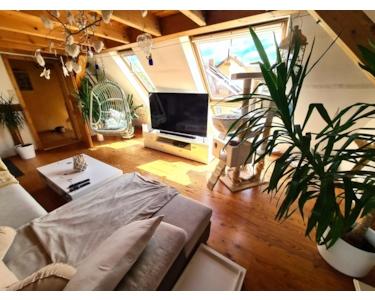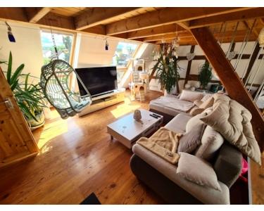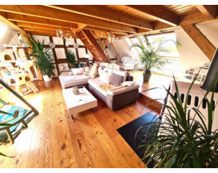 Das sehr atmosphärische Wohnzimmer mit seinem Schwedenofen befindet sich eine weitere Ebene höher und bietet Ihnen mehrere bodentiefe Fenster, schönes Sichtgebälk, sehr schöne Großzügigkeit und eine Treppe in einen kleinen Gästeschlafbereich oder auch in eine Bürozimmer, je nach Nutzung.