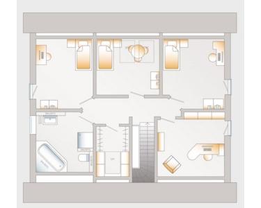 Im Dachgeschoss des Hauses sind zwei schöne Kinderzimmer, ein Elternschlafzimmer, ein Flur und ein Familienbad untergebracht. Die Lage der Treppe und des Haustechnikraumes sind fixiert.