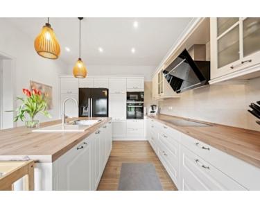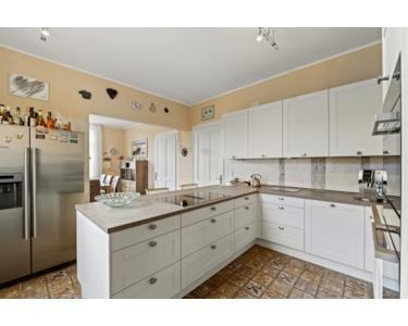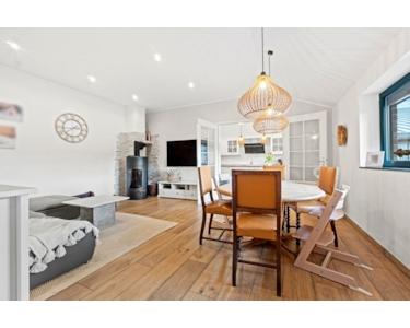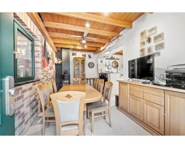 - EG: offener Essbereich mit neuwertiger Küche inkl. Einbauküche (ca. 1,5 Jahre, VHB) und Zugang zum Innenhof, Wohnzimmer (inkl. Specksteinkamin, VHB) mit anschließendem Duschbad, über kleine Treppe Büro und Abstellraum