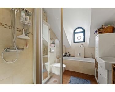 - 1. OG: Große Ankleide (auch als Schlafzimmer nutzbar) mit Zugang zum Waschraum, über Waschraum kleiner Speicher: Zugang mit Dachbodenleiter, Diele, 2 Schlafzimmer, weiteres kleines Zimmer, modernes Badezimmer (große Badewanne und ebenerdige Dusche)