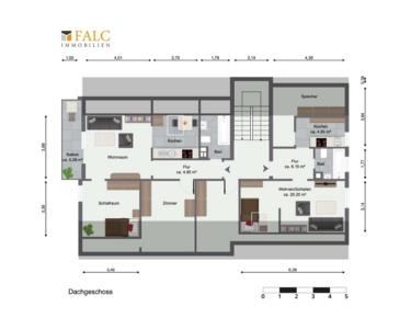 Im Dachgeschoss befindet sich auf der linken Seite des Hauses eine 1-Zimmer-Wohnung, mit praktischer Küche, einem Tageslichtbadezimmer mit Badewanne sowie einem ca. 22 m² großen Wohn- und Schlafzimmer - all das verteilt auf ca. 32 m² Wohnfläche. Die rechte Wohnung hingegen verfügt über zwei großzügige Zimmer, eine Küche, ein Tageslichtbadezimmer mit Badewanne und einen gemütlichen Balkon in Südausrichtung. Diese Wohnung umfasst in etwa 60 m². Alle Wohnungen verfügen über Rollläden, um den Wohnkomfort zu erhöhen.