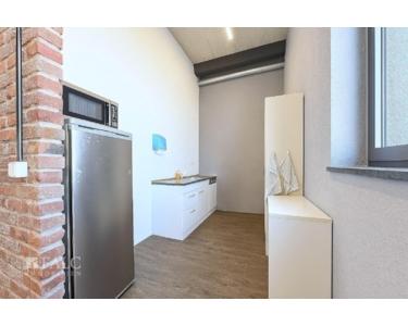 Bereits der Eingangsbereich empfängt mit einer offen gestalteten Küche, die nicht nur funktional ist, sondern auch als Treffpunkt für kurze Pausen oder informelle Gespräche dient. Die großzügige, offene Bürofläche bietet Platz für mehrere Arbeitsplätze und überzeugt mit einer stilvollen Backsteinwand, die dem Raum einen besonderen Charakter verleiht. Die offene Struktur fördert das gemeinschaftliche Arbeiten und den Austausch im Team.