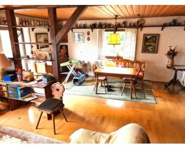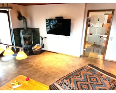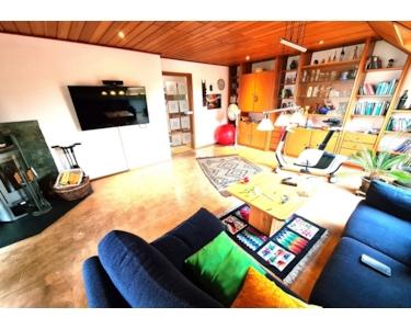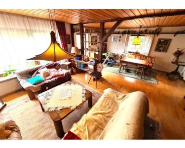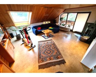 Das Wohnzimmer mit ca. 27 m² (Schrägen bereits abgezogen) bietet Ihnen einen Schwedenofenanschluß (der Kamin hat 2 Züge) und hat direkten Zugang auf den schönen Balkon.