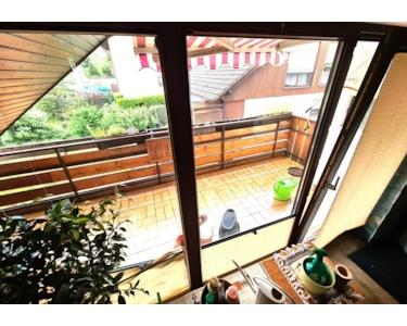 Der Balkon hat eine Markise und mit ca. 9,5 m² eine schöne Größe für einen Tisch mit Stühlen.