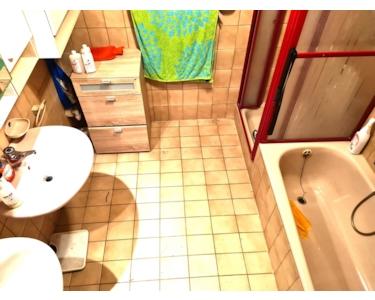 Den Flur entlang befindet sich links das Badezimmer mit Badewanne und Dusche sowie 2 Handwaschbecken.