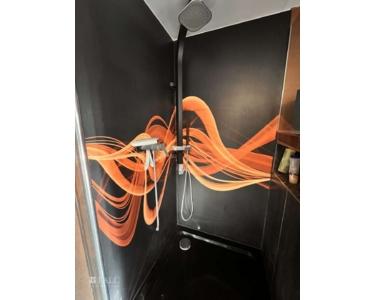 Das Bad im Obergeschoss ist modern ausgestattet und verfügt über eine bodengleiche Dusche, ein WC und ein Waschbecken. Die Funktionalität und die hochwertige Ausstattung sorgen dafür, dass der Raum sowohl komfortabel als auch pflegeleicht ist.