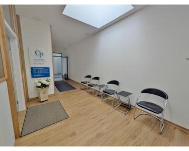 Der Zugang zur Praxis ist komfortabel und barrierefrei über ein gepflegtes Treppenhaus mit Personenaufzug möglich. Ein einladender, gemeinschaftlicher Wartebereich heißt Ihre Patienten willkommen und führt direkt zum Empfangsraum. Der offene Übergang zum Praxisflur bietet Flexibilität – für mehr Privatsphäre kann problemlos eine Tür installiert werden.