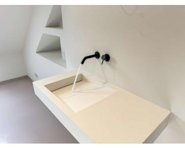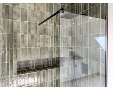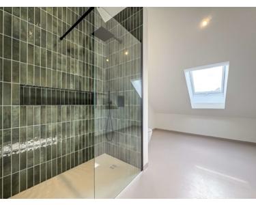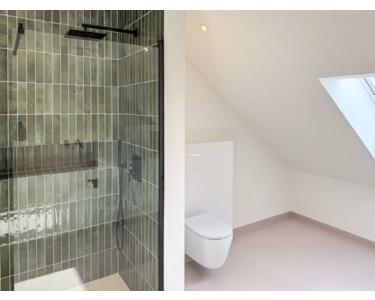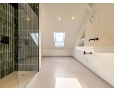 Das Badezimmer ist modern und mit einem fugenlosen Bodenbelag gestaltet. Die Walk-In Dusche ist mit zeitlosen Armaturen und hochwertigen Fliesen ausgestattet. Die integrierten Deckenspots runden diese Ästhetik ab.