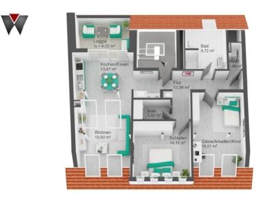 Die Dachgeschosswohnung überzeugt durch ihre einzigartige Ausstattung rund um den wertigen Parkettboden und die Fußbodenheizung. Weiterhin sorgen die Deckenspots und der fließende Übergang von der Wand zum Fußboden für erstklassigen Wohnkomfort.