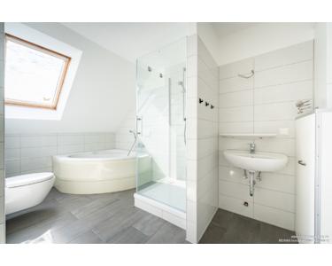 Gleich links beim Betreten der Wohnung befindet sich eine echte Seltenheit, das großzügige lichtdurchflutete Badezimmer, das mit einer Eckbadewanne und einer separaten Dusche ausgestattet ist – ein seltener Komfort in Altbauwohnungen.
