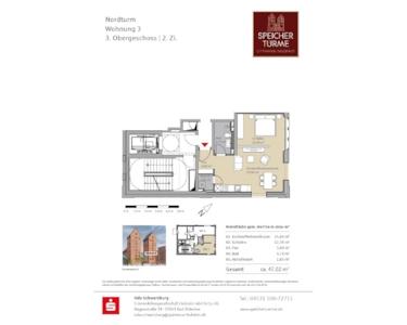 Der Nordturm der „Speichertürme“ bietet insgesamt 15 Eigentumswohnungen mit 2 bis 3 Zimmern bei Wohnflächen von ca. 46 bis 116 qm. Die Maisonette-Wohnung 15 erstreckt sich über zwei Etagen im 9. und 10. OG, die über eine Wendeltreppe verbunden ist.