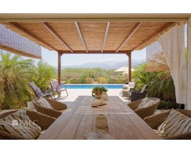 Der Außenbereich ist für das Leben im Freien konzipiert und bietet eine Außenküche mit Pizzaofen, Essbereich und Loungezone – ideal, um in Ruhe zu entspannen oder schöne Stunden mit Familie und Freunden zu verbringen. Der 38 m² große Salzwasserpool lädt ebenso zum Erholen ein wie der angrenzende Jacuzzi, mit freiem Blick auf die imposanten Weißen Berge. Der gesamte Bereich bietet absolute Privatsphäre. Die Jalousien rund um den zentralen Terrassenbereich lassen sich komplett schließen – so kann der Raum ganzjährig genutzt werden.