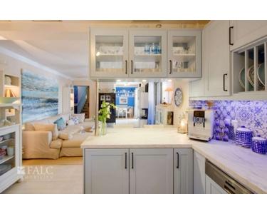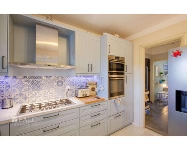 Beim Betreten des Hauses gelangen Sie zunächst in einen Flur mit bodentiefen Einbauschränken, die großzügigen Stauraum bieten. Auf der linken Seite des Erdgeschosses befindet sich das erste (Gäste-)Schlafzimmer mit einem voll ausgestatteten Ensuite-Badezimmer. Zur rechten Seite öffnet sich der beeindruckende, offene Wohnbereich. Die neu eingebaute Küche ist mit hochwertigen Neff-Geräten ausgestattet, darunter ein 5-Flammen-Gaskochfeld von Foster, ein amerikanischer Kühlschrank mit Wasseranschluss für gefiltertes Wasser und Eiswürfel sowie eine Spüle mit einem zusätzlichen Wasserhahn und separatem Trinkwasserfiltersystem.