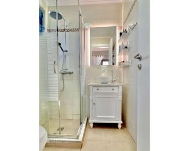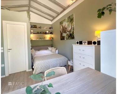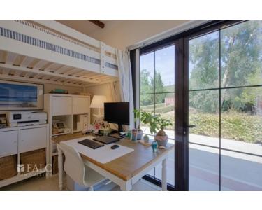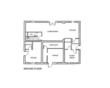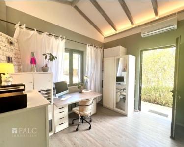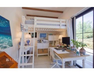 Auf der Ostseite des Hauses führt ein separater Eingang in das Studio mit eigenem Bad. Die außergewöhnlich hohe Decke mit weiß gekalkten Holzbalken verleiht dem Raum einen besonderen "Haus-im-Haus"-Charakter. Das Studio kann bei Bedarf mit dem Haupthaus verbunden oder vollständig als eigenständige Einheit genutzt werden – die Anschlüsse für eine Küche sind bereits vorbereitet.