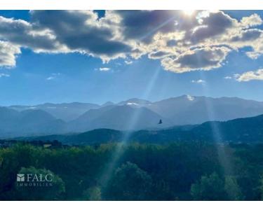 Direkt dahinter, hinter der Kücheninsel, bildet ein dreiseitiger Kamin das Herzstück des großzügigen Wohnzimmers, das sich mit bodentiefen Türen zur großen überdachten Terrasse hin öffnet. Eine handgefertigte Schiebetür im Scheunenstil führt zu einem zusätzlichen Gäste-WC sowie zur Treppe in das Obergeschoss. Dort erwartet Sie die luxuriöse Master-Suite mit hellem Schlafzimmer, Ankleide und einem stilvollen Badezimmer mit freistehender Badewanne, begehbarer Dusche und elegantem Waschtisch. Die riesige Balkonterrasse mit Markise bietet atemberaubende Ausblicke auf den Garten, die malerische Landschaft, das Tal und die majestätischen Berge.