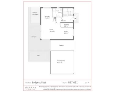 Von einem großzügigen Eingangsbereich im Erdgeschoss erreicht man den mit viel Atmosphäre und Lichtdurchflutung ausgestatteten Wohnraum mit einem ebenso großzügigen Essbereich und offenem Küchenbereich. Im Wohnbereich befindet sich auch ein Kaminofen mit Schieferabdeckungen, passend zum Charakter des Hauses. Entspannung findet man auch auf den vom Wohnbereich mit Schiebetür zugängigen zwei Terrassen und einem ca. 3x6 Meter Außenpool. Das Gäste-WC, von der Diele begehbar, verfügt auch über eine Dusche.