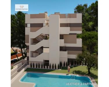 Der moderne Wohnkomplex umfasst 14 hochwertige Wohneinheiten mit 2 oder 3 Schlafzimmern sowie 1 bis 3 Badezimmern. Die Architektur verbindet mediterranen Stil mit zeitgemäßem Design und bietet vielfältige Grundrisse, darunter Wohnungen mit Garten, elegante Penthäuser mit Solarium und Duplexwohnungen mit großzügigem Solarium – ideal für ein modernes, mediterranes Lebensgefühl.