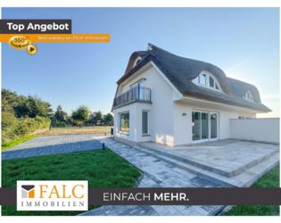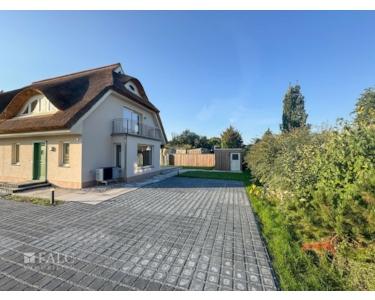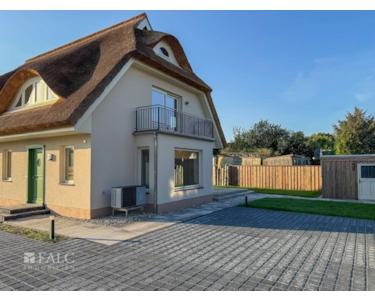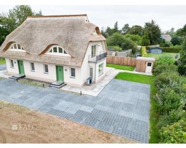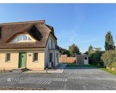Die Doppelhaushälfte ist mit einem Rohrdach und einem charakteristischen Krüppelwalmdach mit