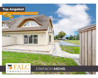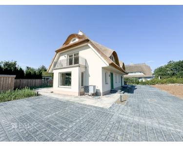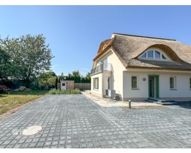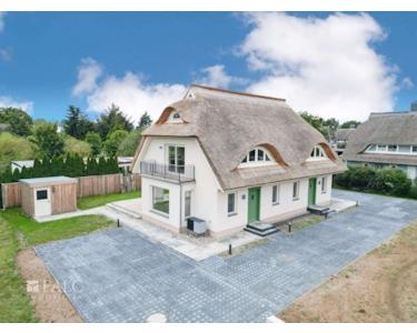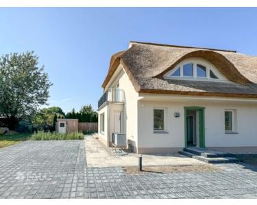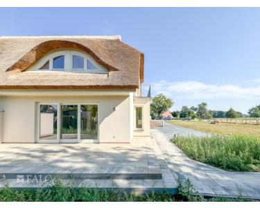 Die Doppelhaushälfte ist mit einem Rohrdach und einem charakteristischen Krüppelwalmdach mit