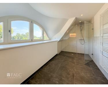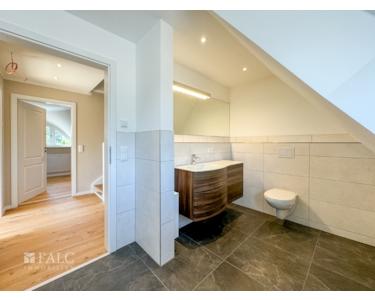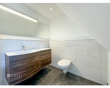 Im Dachgeschoss finden Sie ein modern ausgestattetes Badezimmer mit einer großen Dusche, einem WC,