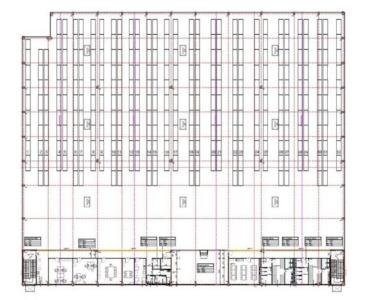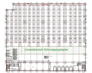 Die Halle hat einen Betonboden mit einer Tragkraft von 5000 kg/m². Die Höhe beträgt ca. 10 m UKB. Lichtbänder und Lichtkuppeln sorgen für ausreichend Tageslicht. Die Beleuchtung erfolgt durch ein LED-Lichtbandsystem. Eine Regalierung durch den Vermieter ist möglich. Drei Ladestationen für elektrische Gabelstapler sind vorhanden. Sechs Toranlagen, davon fünf als Verladerampen, sind über einen Tiefhof angebunden. Die gedämmten Sektionaltore werden elektrisch betrieben. Eine Schnelllademöglichkeit für LKWs ist möglich. Steckdosen und Starkstromanschlüsse sind ausreichend vorhanden und werden nach Mieteranforderungen positioniert. Weiter sind das Lagerbüro, diverse Nebenräume, zwei WC-Anlagen und zwei Treppenhäuser vorhanden.