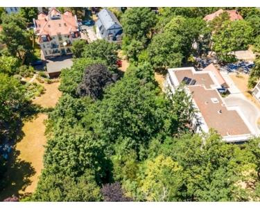 Dieses mit Bäumen bewachsene Baugrundstück ist auf zwei Seiten von Villen und Mehrfamilienhäusern umgeben, auf zwei von Wald und Wiese.