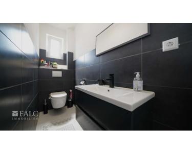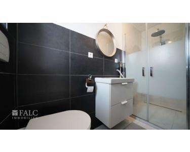 Das Tageslichtbad überzeugt mit einer großzügigen, bodengleichen Dusche, eleganter schwarzer Verfliesung und modernem Design. Perfekt für den Frischekick am Morgen oder entspannende Momente am Abend.