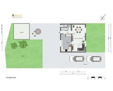 Das Erdgeschoss erreichen Sie über vier Stufen auf der Rückseite des Hauses. Der großzügige Wohn- und Essbereich empfängt Sie mit Offenheit, Licht und einer warmen Atmosphäre. Ein durchdachter Wanddurchbruch schafft eine stilvolle, dezente Trennung der Bereiche und verleiht dem Raum Struktur, ohne an Weite zu verlieren. Die großen Fenster lassen viel Tageslicht herein und laden dazu ein, hier wertvolle Zeit mit Familie und Freunden zu verbringen – sei es beim gemeinsamen Essen, Spielen oder einfach zum Entspannen.