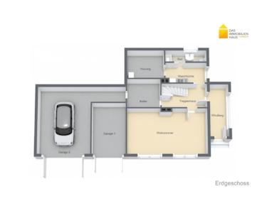 Erdgeschoss: Windfang, Treppenhaus, Waschküche, Bad, Wohnzimmer, Heizungsraum, Keller, 2 Garagen