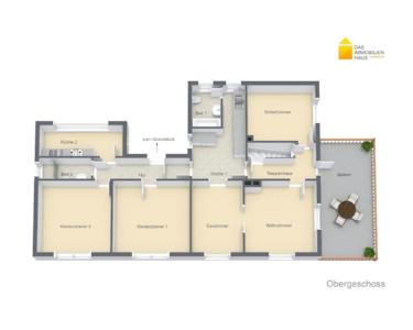 Obergeschoss: Treppenhaus, Flur, Schlafzimmer, überdachter Balkon, Wohnzimmer, Esszimmer, 2 Küchen, 2 Bäder, 2 Kinderzimmer
