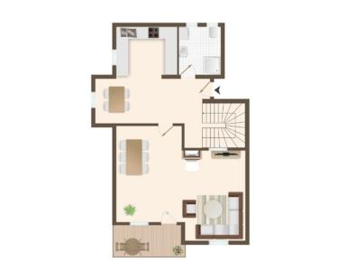 Der zentrale Mittelpunkt der Wohnung ist der große, helle Wohnbereich im 1. Obergeschoss, der mit einem Kamin für besondere Wohnatmosphäre sorgt. Von hier aus gelangen Sie auf einen der beiden Balkone. Die offen gestaltete Küche mit angrenzendem Essbereich fügt sich harmonisch in den Wohnraum ein und bietet viel Platz für geselliges Kochen und Beisammensein. Auf derselben Etage befindet sich außerdem ein Badezimmer mit Dusche.
