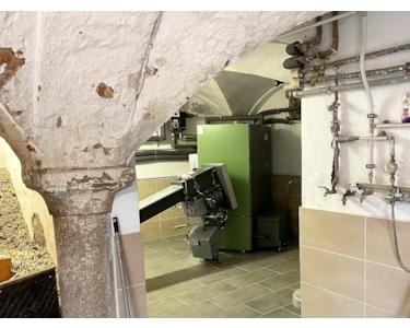 Sie teilt sich im Erdgeschoss in eine große Küche mit Essplatz, ein Wohnzimmer, ein Badezimmer mit Dusche sowie einen Abstellraum auf. Im 1. Obergeschoss befinden sich drei Schlafzimmer. Aus unserer Sicht bieten sich die Wohnungen auch sehr gut zum Zusammenlegen und zur Nutzung als großes Einfamilienhaus an. Die stilvollen Gewölberäume im Erdgeschoss werden aktuell als Heizraum und Lagerraum für die Hackschnitzelheizung genutzt.