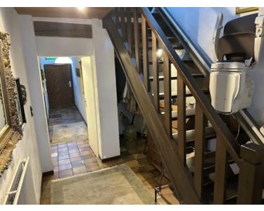 Geradeaus gelangen Sie zur Hauptwohnung, die mit einem charmanten **Essbereich** beginnt, direkt angrenzend zur **offenen Küche** mit Zugang zur **überdachten Terrasse** und in den gepflegten Garten. Vom Esszimmer führt der Weg in das gemütliche Wohnzimmer sowie weiter ins separate **Fernsehzimmer** – perfekt für entspannte Stunden. Über eine stilvolle **Massivholztreppe** erreichen Sie das Obergeschoss, wo drei Schlafzimmer, ein **großes Duschbad** sowie ein weiteres **Bad mit Wanne** auf Sie warten. Die offene Galerie gewährt zudem einen Blick hinunter zum Essbereich.