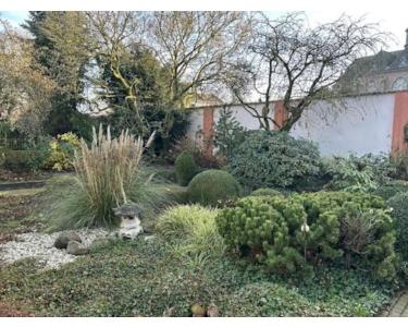 Zur Immobilie gehört eine **Garage für zwei Fahrzeuge**, die zusätzlich einen Zugang zum **Kellerbereich** mit weiterem Stauraum bietet. Im rückwärtigen Gartenbereich finden Sie ein **Nebengebäude** mit Hauswirtschaftsraum, Duschbad und zwei vielseitig nutzbaren Räumen – ideal als Werkstatt, Atelier oder Hobbyfläche. Die daran anschließende **Sonnenwiese** lädt zum Verweilen und Entspannen ein.