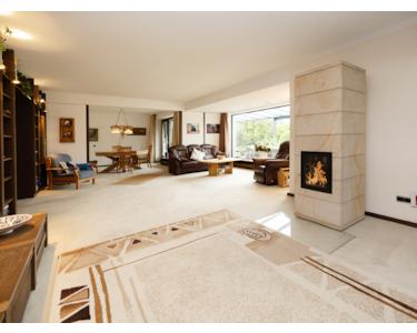 Der Eingangsbereich öffnet sich sanft in den großzügigen Wohnbereich, der durch stimmige Proportionen und eine harmonische Raumführung beeindruckt. Ein stilvoll gesetzter Kamin bildet den behaglichen Mittelpunkt dieses Lebensraumes – ein Ort, an dem sich Rückzug und geselliges Beisammensein auf ganz natürliche Weise begegnen. Die angrenzende Bar schafft Raum für unbeschwerte Stunden mit Gästen, während der Essbereich sich bei Bedarf durch Schiebeelemente vom übrigen Wohnraum abtrennen lässt – so entstehen sowohl Weite als auch Rückzugsorte ganz nach Wunsch.