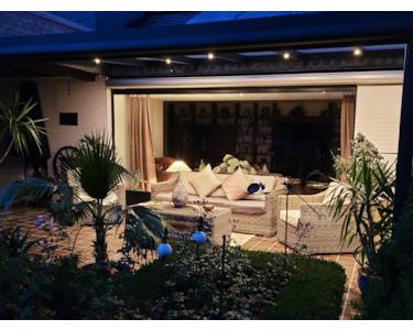 Licht spielt in diesem Haus eine tragende Rolle: Große Fensterflächen holen die Natur ins Haus, geben den Blick frei auf den mit Bedacht gestalteten Garten und füllen die Räume mit einer sanften Helligkeit. Die angrenzende Terrasse lädt mit ihrem Außenkamin dazu ein, den Tag in Ruhe ausklingen zu lassen – sei es im Kreis lieber Menschen oder in stiller Verbundenheit mit der umgebenden Natur.