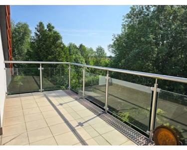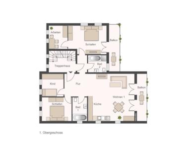 Die Wohnung im Obergeschoss bietet auf ca. 119 m² fünf gut geschnittene Zimmer, einen offenen Wohn- und Essbereich mit ca. 38 m² Fläche sowie zwei Bäder. Zwei große Balkone ermöglichen entspannte Ausblicke ins Grüne und machen die Wohnung zu einem perfekten Rückzugsort für Familien.