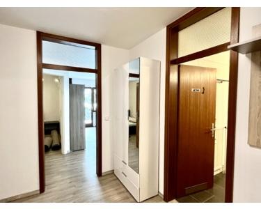 Die Wohnung beginnt mit einer Diele, von der es in das Duschbad, den Abstellraum und den Wohn- Ess- und Küchenbereich geht, in diesem Raum ist ein Teil als kleines Schlafzimmer mit Schrank und einem 1,60 Mtr. breitem Bett abgeteilt.