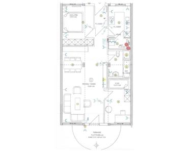 Die Wohnung verfügt über ein innenliegendes, gefliestes Badezimmer mit sowohl einer Badewanne als auch einer Dusche. Der Küchenbereich ist ebenfalls gefliest und bietet Zugang zu einem kleinen Abstellraum, in dem sich der Waschmaschinenanschluss befindet.