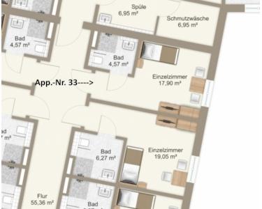 - Diese Pflegeappartements haben in der Regel eine Größe von ca. 45 bis 50 m², die sich aus der Größe des Bewohnerzimmers (ca. 22,47m²) sowie der sogenannten Gemeinschaftsfläche (ca. 23,45 m²) zusammensetzt.