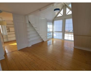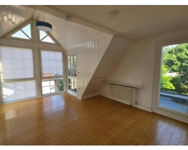 Das Obergeschoss erreichen Sie über eine geschwungene Holztreppe. Dort erwarten Sie zwei lichtdurchflutete Schlafzimmer mit stilvollen Landhausdielen. Die Räume sind durch eine weiße Flügeltür miteinander verbunden. Das größere Schlafzimmer verfügt über ein separates Ankleidezimmer, das zweite über den charakteristischen Erker und direkten Zugang zum Balkon. Ein großzügiges Tageslichtbad mit zwei Waschbecken und Badewanne rundet das Raumangebot auf dieser Etage ab.