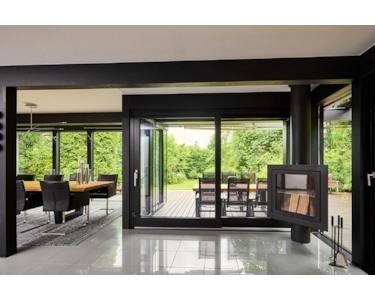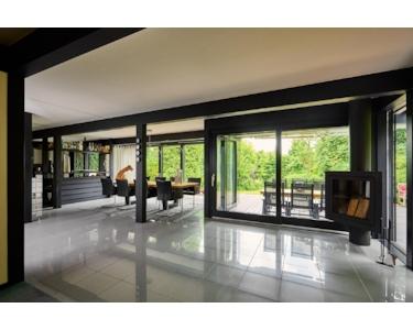 Wir bieten Ihnen ein modernes Fachwerkhaus mit schwarzem Fachwerk und Ausfachungen in Glas bzw weissem Dämmputz.